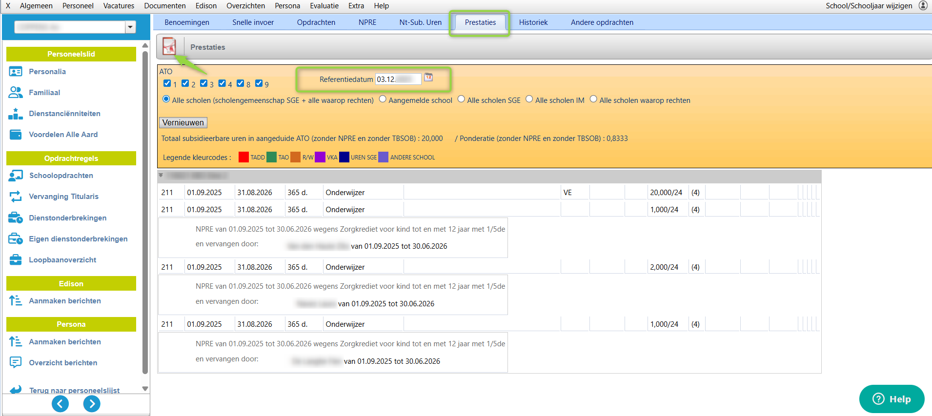 Via het tabblad 'prestaties' , kan een overzicht bekomen worden van de opdrachten (zowel gepresteerd als niet-gepresteerd) op een bepaalde referentiedatum binnen het schooljaar.