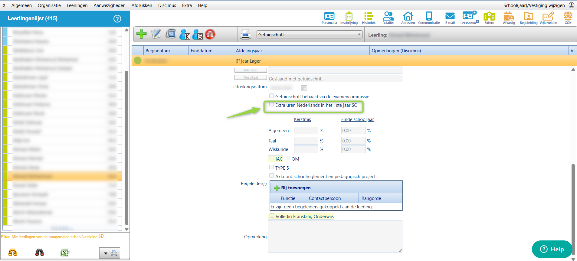 Indien van toepassing moet het veld 'Extra uren Nederlands in het 1ste jaar SO' worden aangevinkt op het tabblad 'Inschrijving'.