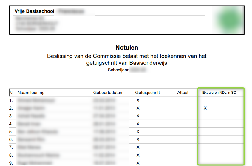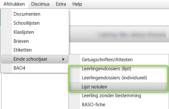 Via menu Afdrukken > Einde schooljaar kan je hiervan een vermelding terugvinden op volgende afdrukken: