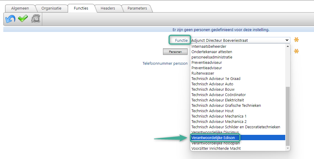 Dit kan langs menu Algemeen > School > tabblad 'Functies' via het plusteken. Kies bij het veld 'Functie' de functie 'Verantwoordelijke Edison' uit de lijst: