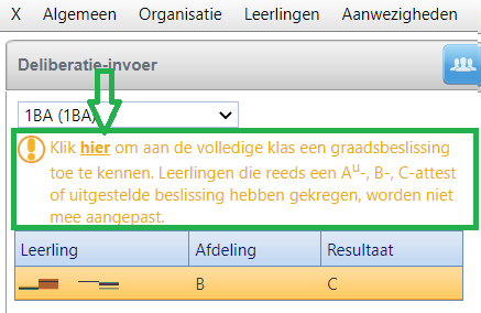 Na het uitvoeren van stap 1 krijgt u bij de deliberatie-invoer een aantal extra mogelijkheden. Die gebruikt u bij de betreffende leerling (in geval van een individuele graadsbeslissing o.w.v. tekorten) of klas (in geval van een klassikale graadsbeslissing o.w.v uitstel van eindbeslissing tot het einde van de graad).