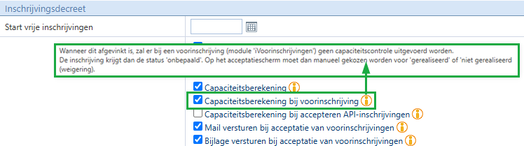 De overige velden zijn van toepassing voor wie leerlingen toevoegt via onze applicatie iVoorinschrijvingen of via de inschrijvings-API. Door met de muisaanwijzer over het info-icoontje te hoveren kan je bijkomende informatie oproepen over de werking van deze velden.