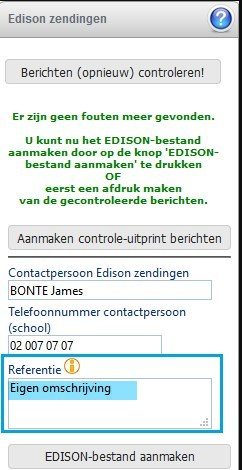 Bij het aanmaken van het Edisonbestand (menu Edison > Zending aanmaken) kan je een eigen referentie meegeven aan de zending. Dit is een korte samenvatting van wat er in de betreffende zending is opgenomen.