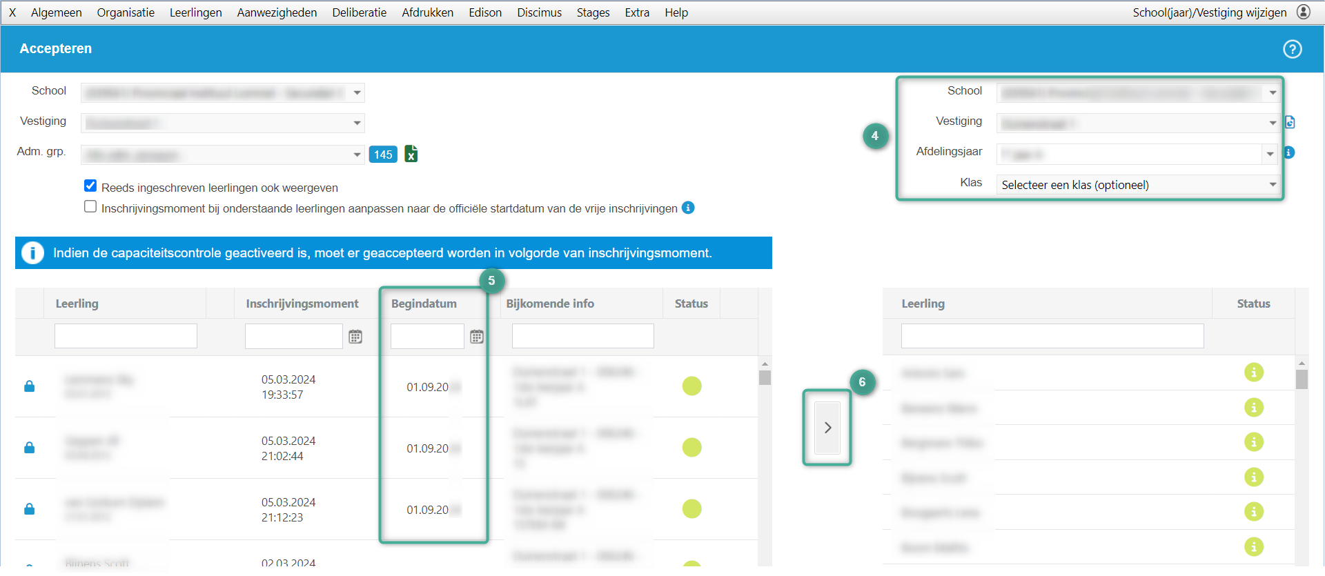 Is alles correct ingevuld, dan kan je de geselecteerde leerling(en) overzetten via de (6) pijltjestoets tussen de twee kolommen.