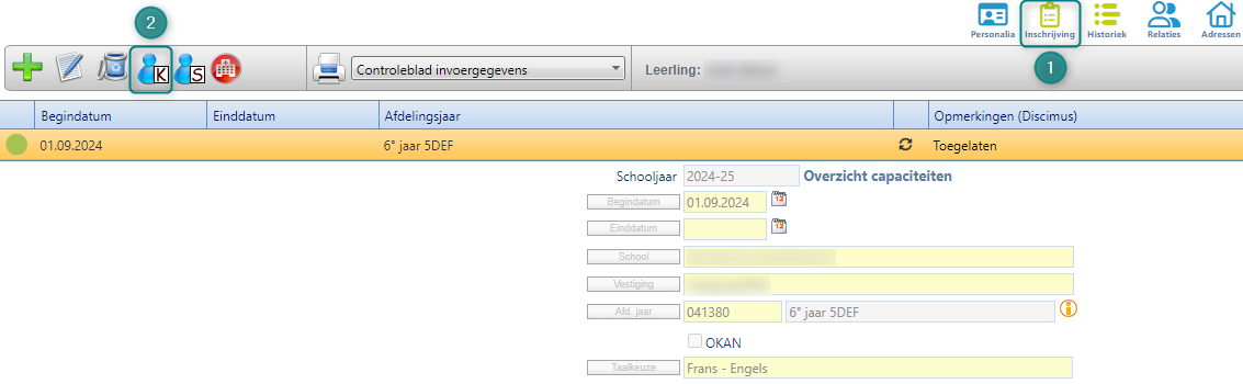 Selecteer op de inschrijvingsfiche (1) de huidige inschrijving en klik bovenaan op het blauwe mannetje met de 'K' (2):