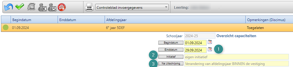 Vul op de inschrijvingsfiche de einddatum van de huidige inschrijving (1) in (dit is de laatste dag in de vorige richting) + de velden ‘Initiatief’(2) en ‘Na Uitschrijving’ (3) (verandering van afdelingsjaar binnen de school/vestiging) die automatisch tevoorschijn komen nadat de einddatum werd ingevuld: