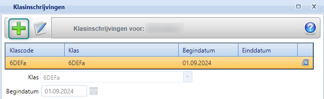 Nadat u de uitschrijving hebt bewaard, voegt u de nieuwe inschrijving toe in het nieuwe afdelingsjaar en klasgroep. Klik hiervoor op het groene plusteken (1) in het tabblad ‘Inschrijving’ en vul de