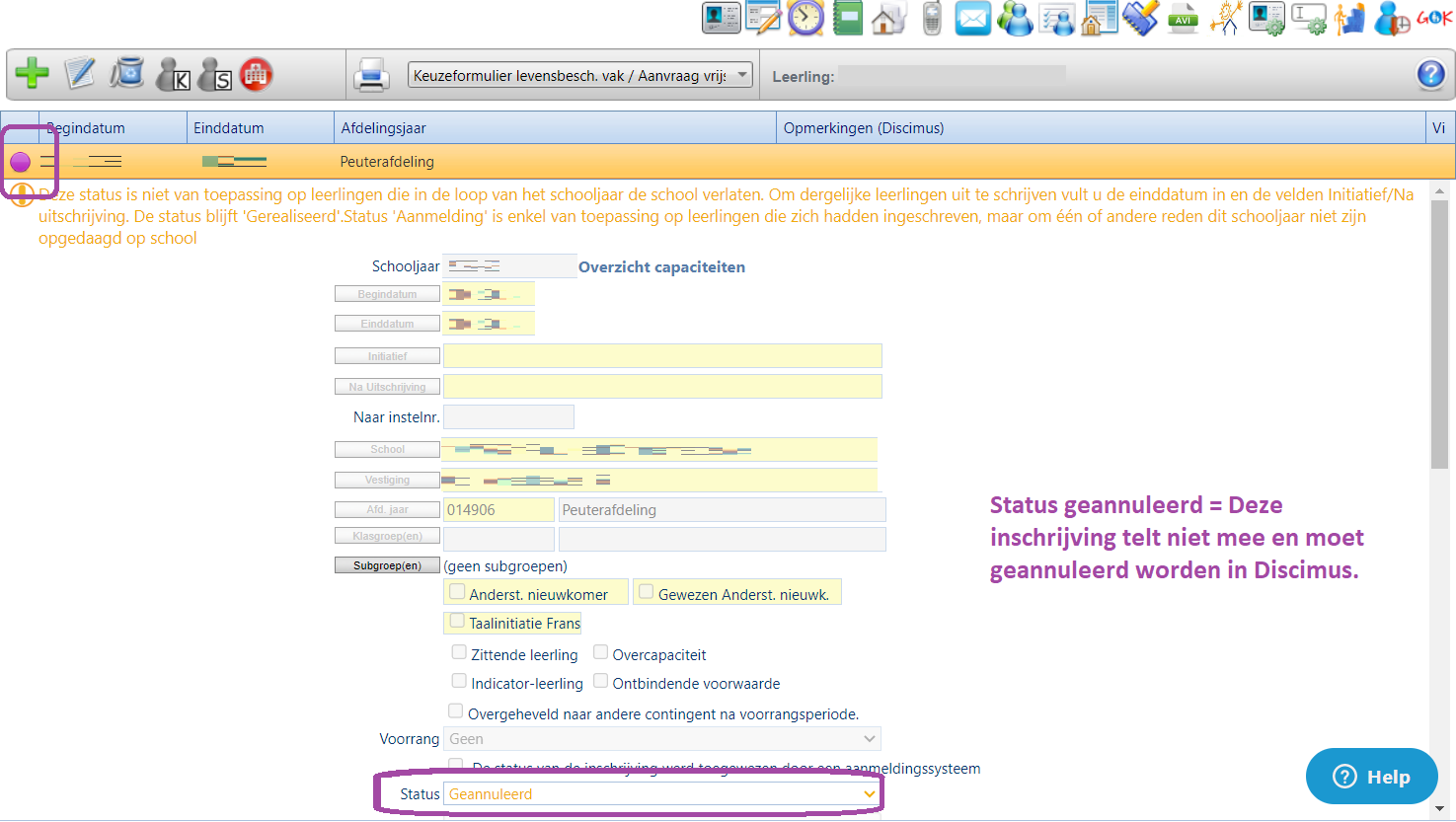 Wijzig de status naar 'Geannuleerd' op tabblad 'Inschrijving'. Door deze aanpassing wordt deze inschrijving geannuleerd in Discimus.