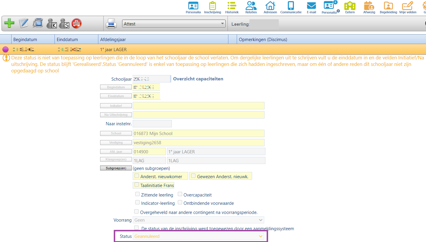 Bij leerlingen die niet gestart zijn op jouw school of niet komen opdagen zijn of die je verkeerdelijk hebt overgezet naar het nieuwe schooljaar zet je via menu Leerlingen > Consulteren op het tabblad 'Inschrijving' de inschrijvingsstatus op 'Geannuleerd'. Annuleer de inschrijving in het schooljaar waarin deze niet komt opdagen.