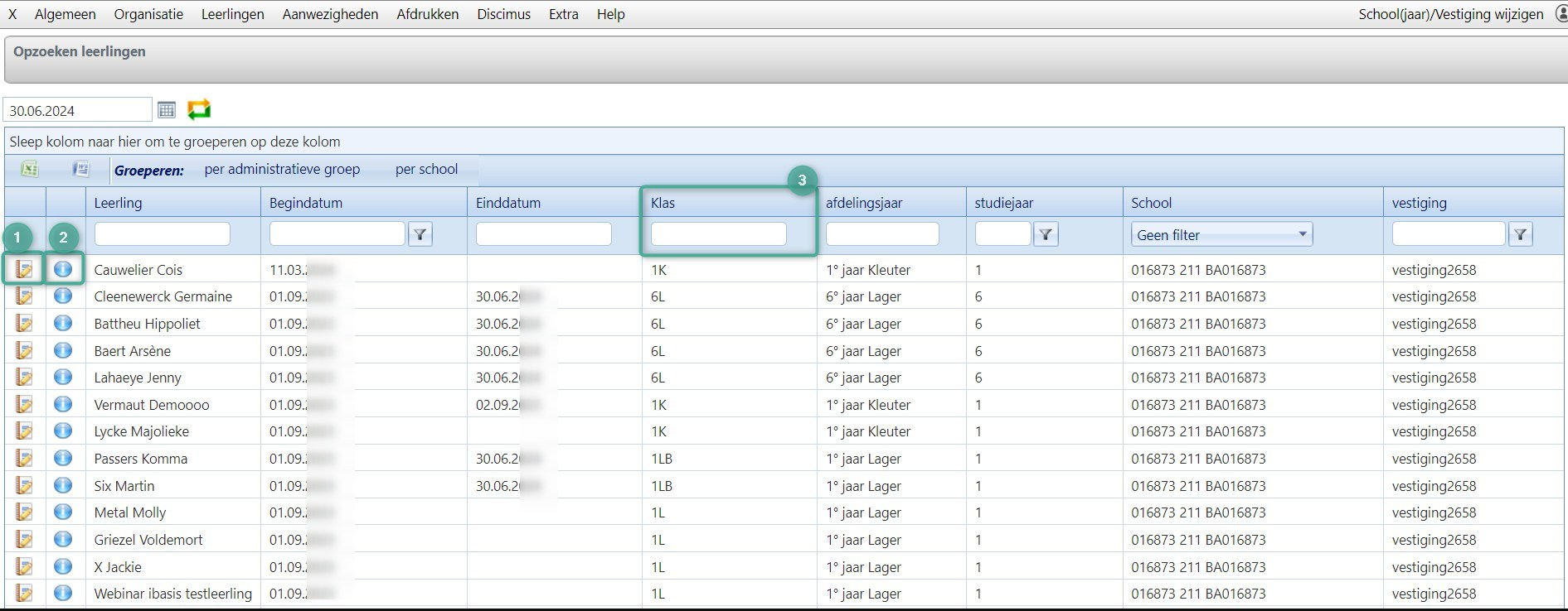 Dit betekent dus o.a. dat leerlingen met eender welke inschrijvingsstatus hier worden getoond. Dit kan bv. handig zijn om een leerling terug te vinden die op status 'Geannuleerd' staat. Als hierbij een wijziging zou moeten gebeuren, kan er na het vinden van de leerling op het inschrijvingssymbool (1) worden geklikt om het inschrijvingstabblad van deze leerling te openen.