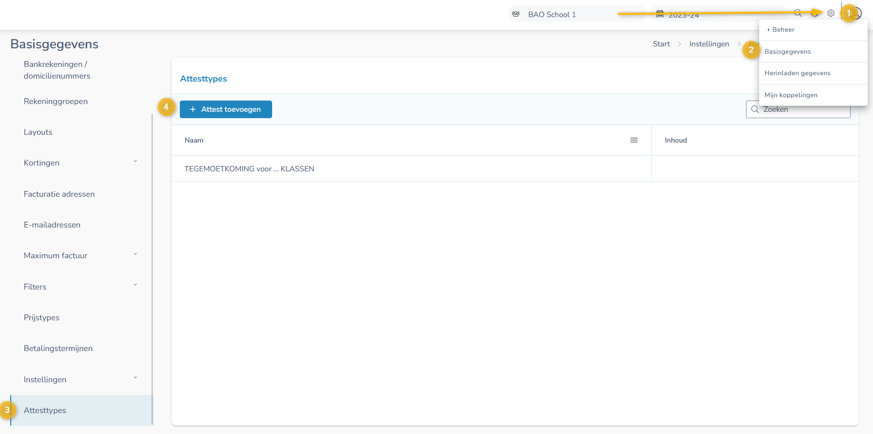 - Ga via het tandwieltje rechtsboven naar Basisgegevens > Attesttypes en klik op Attest toevoegen: